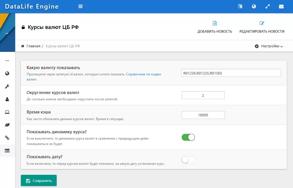 Модуль вывода курсов валют с сайта Центробанка России. В настройках его админ панели настраивается валюта, округление курсов, время кэширования и включение и